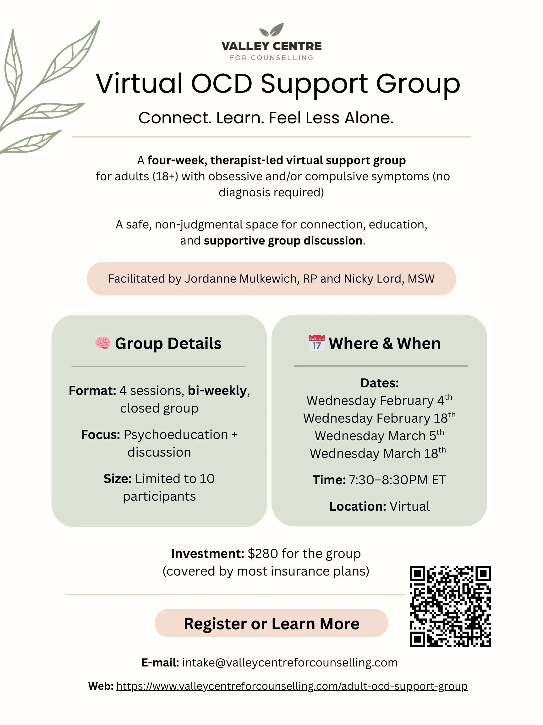A welcoming virtual support group for adults (18+) who identify with having obsessive and/or compulsive experiences and wish for understanding, education, and community.